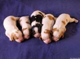 Es sind 1 Rüde blenheim, 3 Hündinnen blenheim und 1 Hündin tricolour.