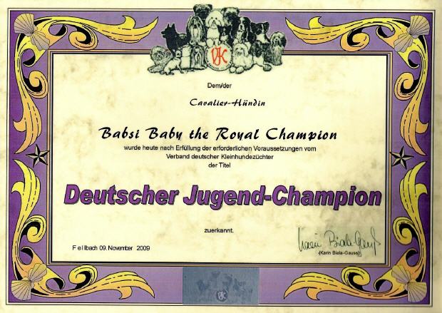 Dt. Jugendchampion 4 x V1, JCAC, 1 x V2, R-JCAC, 2 x V1 und CAC, VDH-CAC, 2 x Beste Hündin, 1 x JBIS 3 (von 18 Junghunden) Landesjugendsieger Berlin-Brandenburg 2009 5 x vv1 von 5 Ausstellungen |
