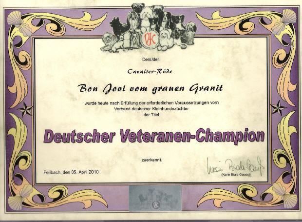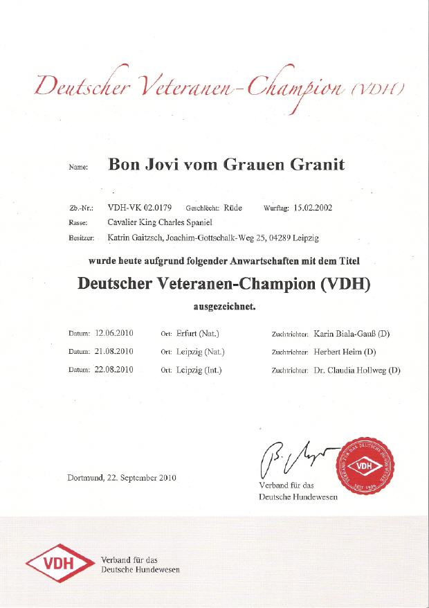 Deutscher Veteranen-Champion VDH Deutscher Veteranen-Champion VK 9 x Platz 1 und Vet-CAC, VDH-Vet-CAC in Folge. Deutscher Champion, Deutscher Jugendchampion , Landesjugendsieger Sachsen, Clubsieger 2006 |