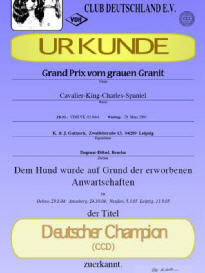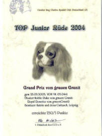 Deutscher Champion, Deutscher Jugendchampion, VDH-Jugendsieger Dresden 2004 Jugend-Clubsieger 2004, Top Junior Rüde 2004 des CCD und Platz 5 in der Offenen Klasse |
